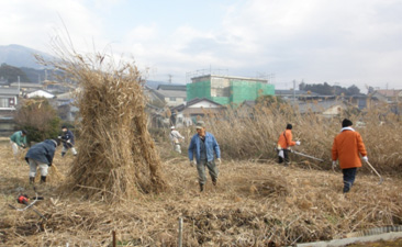 浮島地区一帯には葦原が広がっており、春になる前に野焼きをしているそうですが、民家の近くなどは野焼きが出来ず、人の手で刈らなければなりません。このような大変な作業をお手伝いするために、地元の方約20名とNEXCO中日本グループ社員約20名の計40名で草刈作業をおこないました。