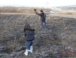 子供たちも、野焼きしたあとに焼けずに残った根を抜くお手伝い