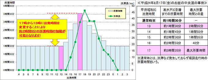 例えば、昨年8月17日(金)に中央道の甲府昭和ICから高井戸ICまで利用した場合では、出発時間をずらすことで渋滞を避けることができ、所要時間の短縮が可能でした。(下表参照)
