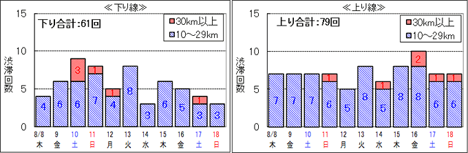 渋滞規模 (1)2013年度 お盆 (2)2012年度 お盆 差[(1)-(2)] 合計 下り 上り 合計 下り 上り 合計 下り 上り 10km以上の渋滞回数 ※ 140 回 61 回 79 回 146 回 58 回 88 回 ▲ 6回 + 3回 ▲ 9回 内30km以上の渋滞回数 12 回 6 回 6 回 12 回 8 回 4 回 ± 0回 ▲ 2回 + 2回 ※30km以上の渋滞を含む
