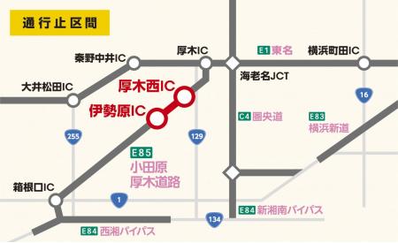 NEXCO中日本 東京支社は、E1A 新東名高速道路(E1A 新東名)の建設事業に伴い、E85 小田原厚木道路 厚木西インターチェンジ(IC)~伊勢原ICの区間で2夜間通行止めを実施させていただきます。また、神奈川県が管理する県道22号および県道63号の一部区間でも併せて夜間通行止めを実施させていただきます。