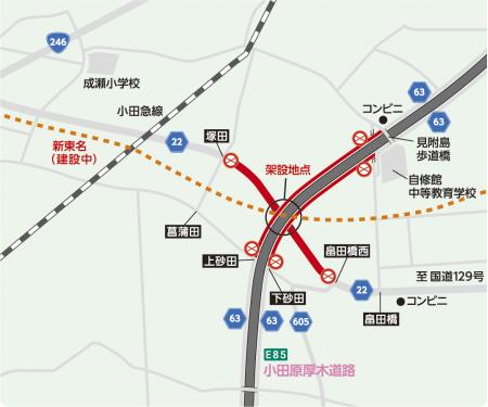 E85 小田原厚木道路、県道22号および県道63号をご利用のお客さまおよび沿道の皆さまには夜間通行止めに伴うう回や渋滞などご不便やご迷惑をおかけいたしますが、通行止め区間のう回路案内など、お客さまへのご迷惑を最小限とするよう取り組んでまいりますので、ご理解とご協力をお願いいたします。